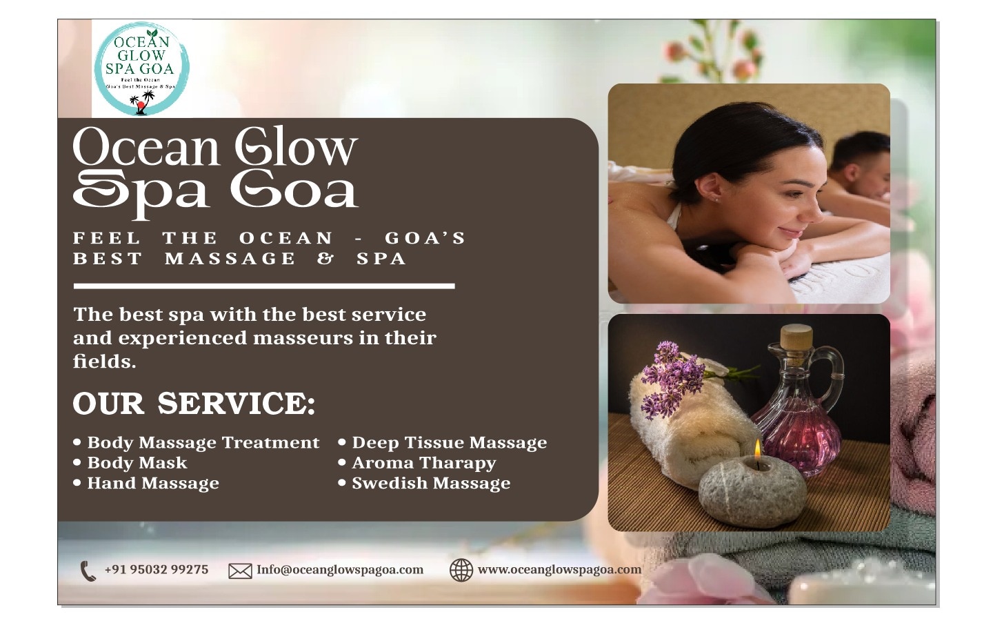 Ocean Glow Spa Goa is a luxurious wellness retreat offering premium spa and massage services in the heart of Goa. Located near popular beaches and tourist destinations, we specialize in a wide range of rejuvenating treatments including Swedish massage, Balinese therapy, Deep Tissue massage, Aromatherapy, Reflexology, and Couple Spa Packages. At Ocean Glow, we blend traditional Indian healing with global wellness techniques to help you relax, rest ... View More